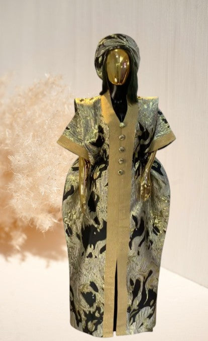 This boubou is a timeless blend of cultural elegance and modern sophistication. Typically crafted from high-quality fabric it showcases intricate patterns, bold colors, and metallic accents. Its flowing silhouette ensures both comfort and a regal appearance, perfect for formal events and celebrations.It comes paired with a matching headpiece to complete the look, making it a satement of heritage, grace, and luxury, designed to celebrate African fashion in all its splendor.