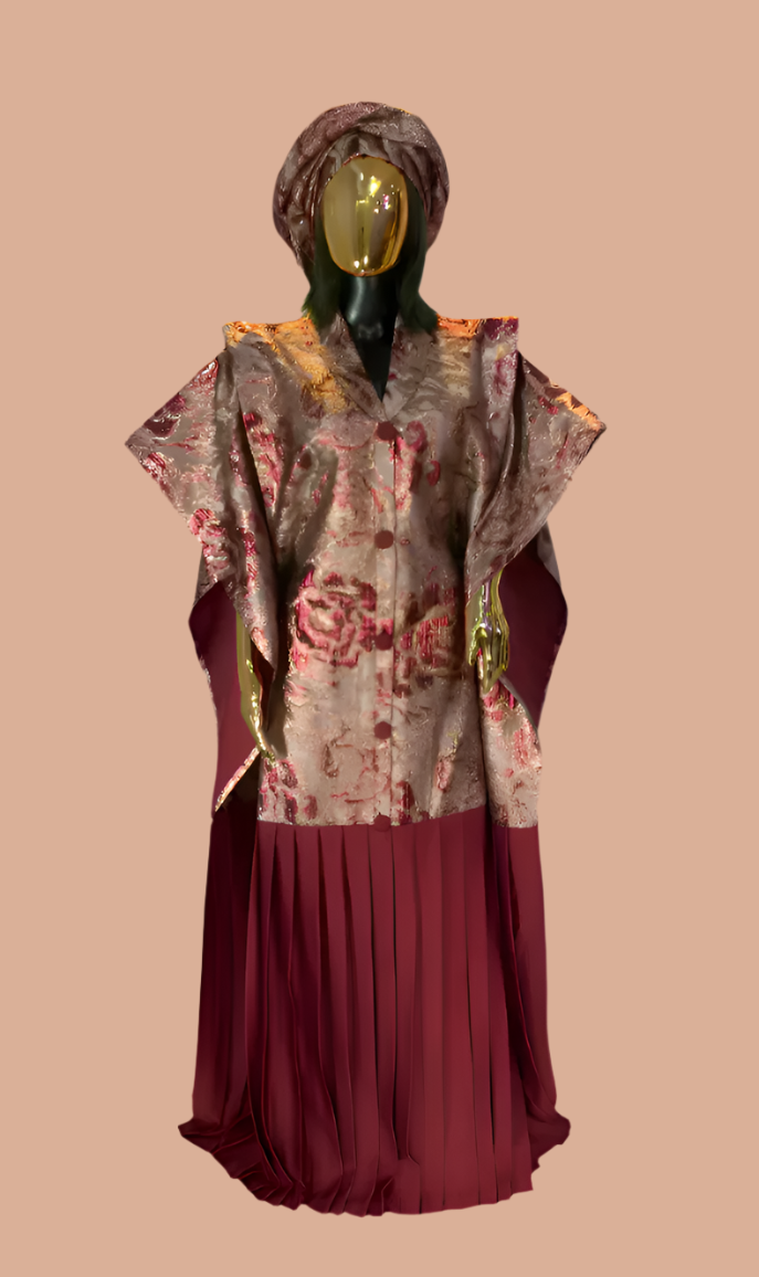 The Adun Boubou is a radiant ensemble that embodies grace and sophistication. Crafted from exquisite jacquard fabric, this set features a vibrant blend of fuchsia pink and royal purple adorned with intricate gold floral patterns, exuding opulence.