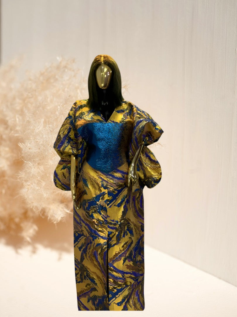 This boubou is a timeless blend of cultural elegance and modern sophistication. Typically crafted from high-quality fabric it showcases intricate patterns, bold colors, and metallic accents. Its flowing silhouette ensures both comfort and a regal appearance, perfect for formal events and celebrations.