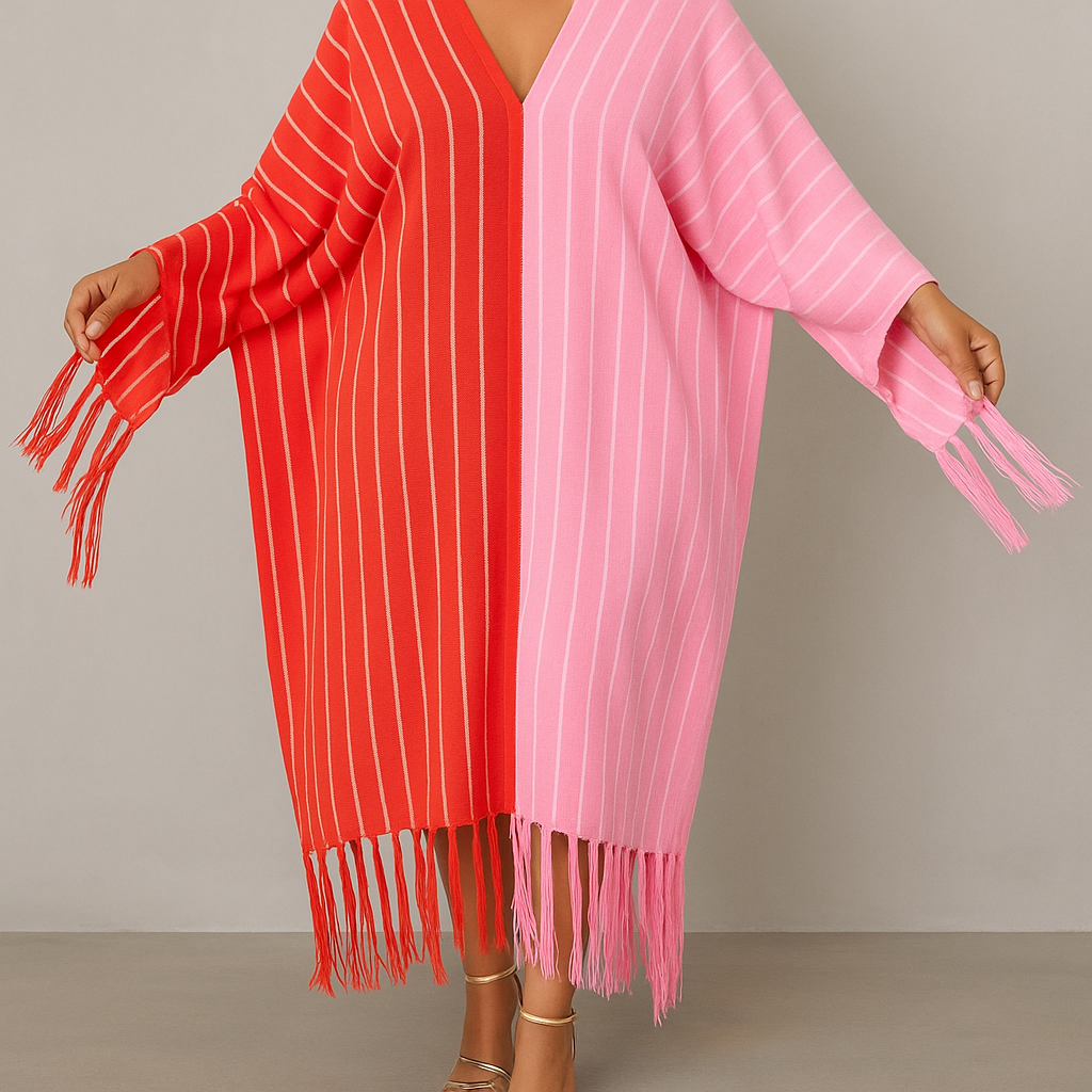 Make a bold and beautiful statement in the Adunni Two-Tone dress, where contemporary color-blocking meets traditional elegance. Designed in rich red and soft pink with delicate white pinstripes, this kaftan is a head-turner from every angle. The oversized fit and flowing silhouette offer ultimate comfort, while the playful fringe hem and extended sleeves bring drama and flair to your movement.