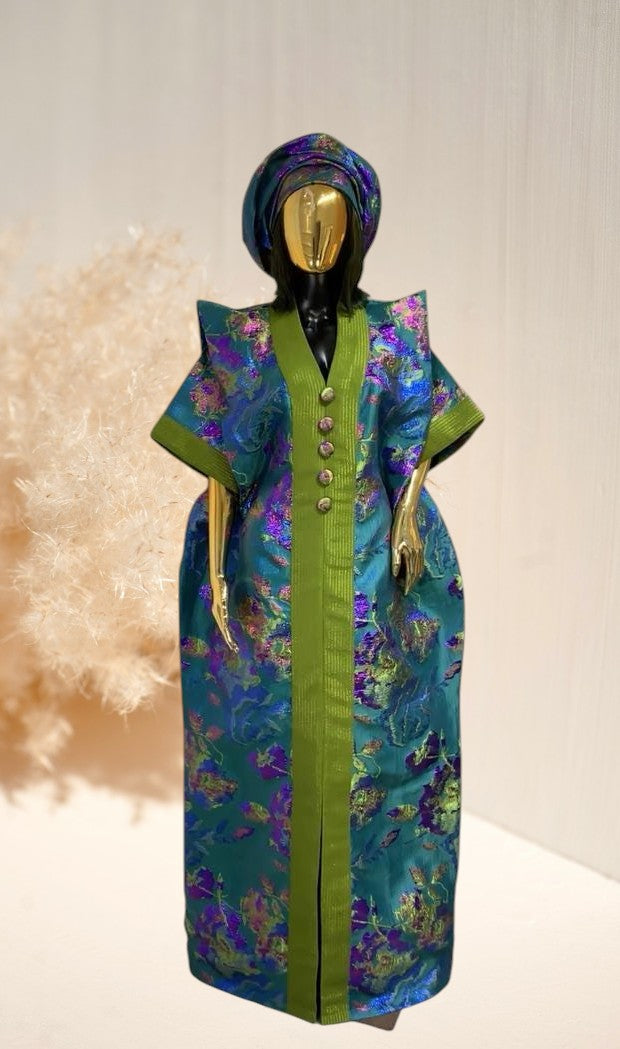 It comes paired with a matching headpiece to complete the look, making it a satement of heritage, grace, and luxury, designed to celebrate African fashion in all its splendor.