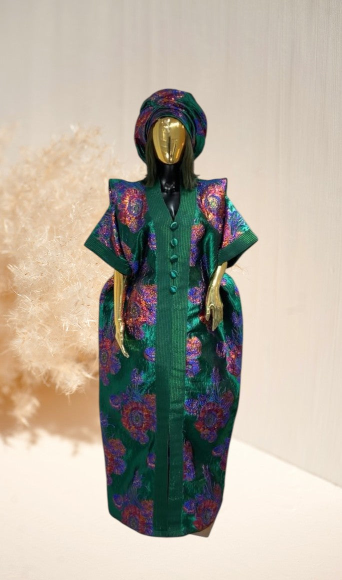 It comes paired with a matching headpiece to complete the look, making it a satement of heritage, grace, and luxury, designed to celebrate African fashion in all its splendour.