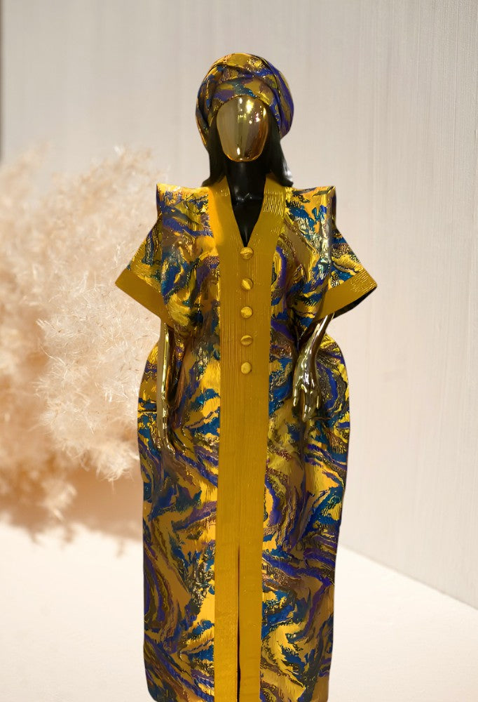 It comes paired with a matching headpiece to complete the look, making it a satement of heritage, grace, and luxury, designed to celebrate African fashion in all its splendor.