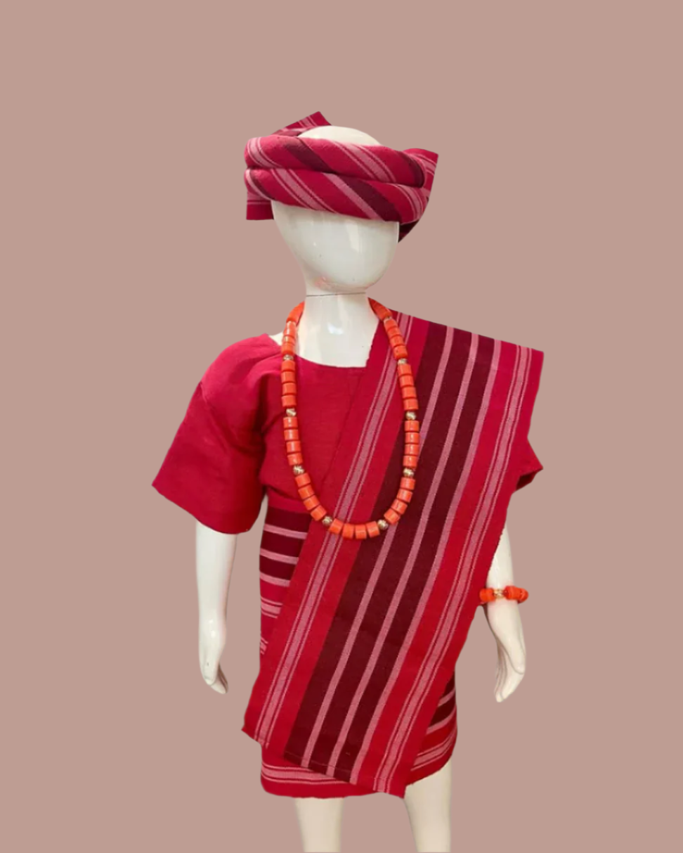 Dress your little one in the Apeke outfit, a charming blend of tradition and elegance. Crafted from premium aso-oke fabric in different shades of red, this set embodies the rich heritage of Yoruba culture.