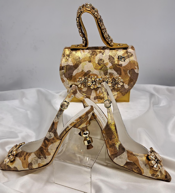 Radiate refined glamour with The Adesewa Set, a luxurious fusion of artistry and sophistication. This exclusive matching shoe and bag duo features a captivating gold-and-bronze camouflage print, finished with delicate floral embellishments and shimmering metallic accents.