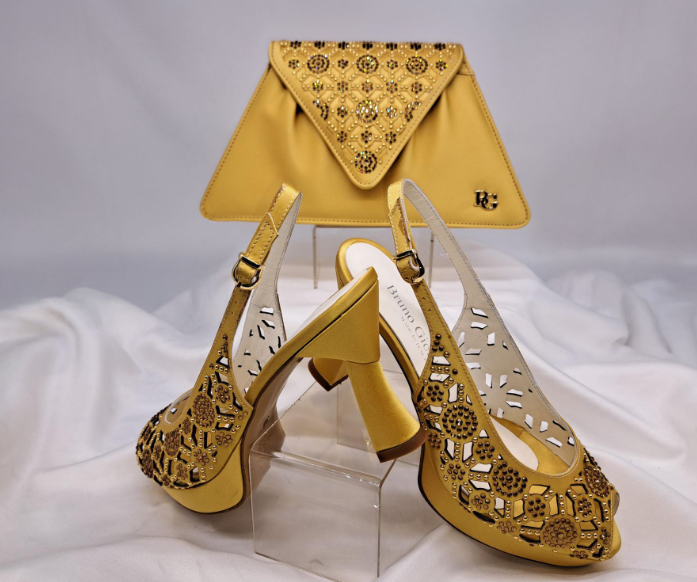 Step into sunshine elegance with The Olufunke Set, a radiant pairing that celebrates confidence and charm. Crafted in a striking golden hue, this matching shoe and bag ensemble features intricate laser-cut patterns adorned with shimmering embellishments that catch the light with every movement.