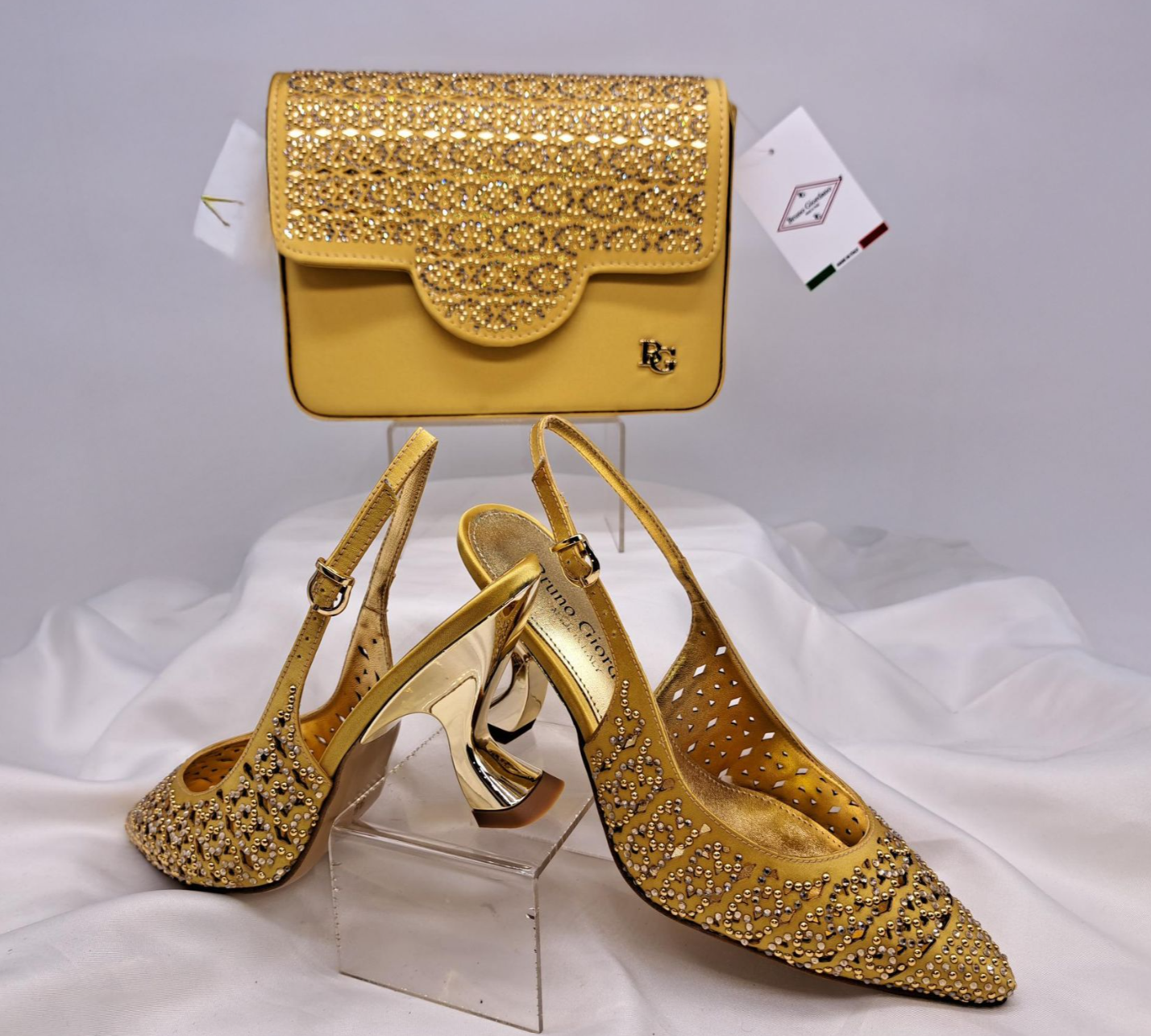 Crafted to perfection, the pointed-toe slingback heels are adorned with exclusive gold stones on a rich satin base, finished with a gleaming 3-inch sculpted luxury heel. The matching clutch dazzles with a lattice of sparkling embellishments that shimmer under every light, adding sophistication to your most memorable occasions.