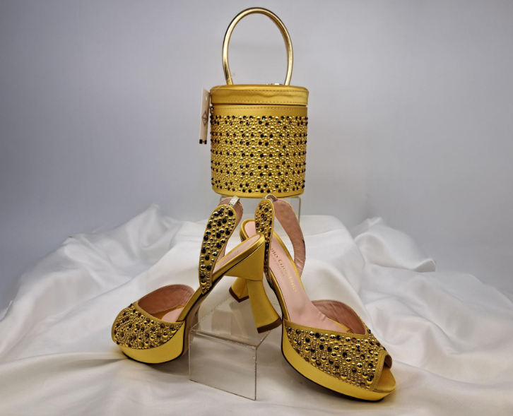 The luxurious gold slingback heels are adorned with hand-laid exclusive stones across the uppers, resting on a sculpted 3.5-inch heel that adds height and poise without sacrificing comfort. Paired with a distinctive cylindrical handbag, fully encrusted in matching stones and finished with a gold handle, this ensemble transforms every step into a statement of refinement and prestige.