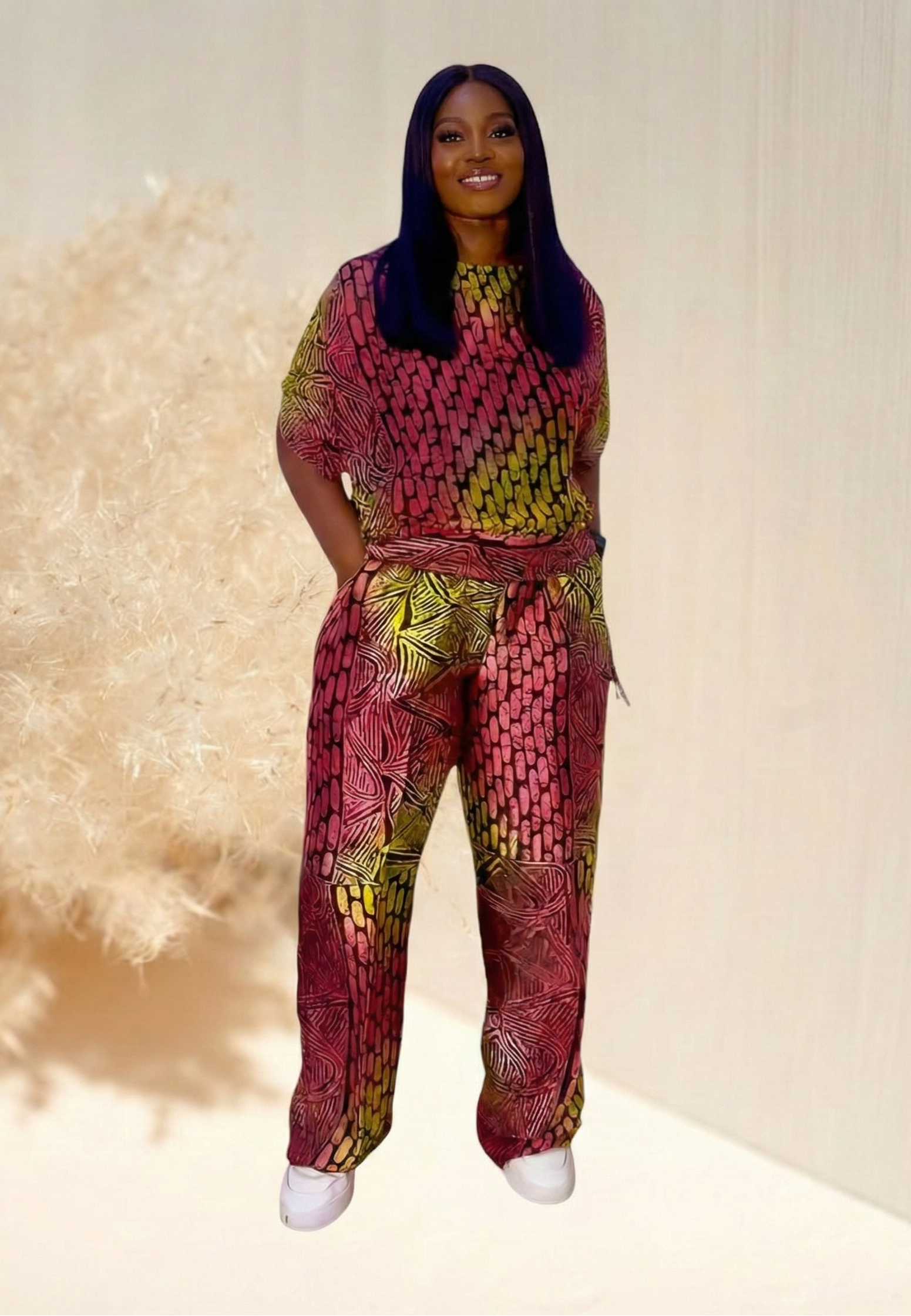 Step into effortless elegance with the Esenam Pants and Top Set, a stunning fusion of heritage and modern sophistication. This two-piece set features a breezy adire chiffon top and flowing silk pants, , crafted with rich, hand-dyed patterns that celebrate African artistry. The relaxed fit ensures comfort while making a bold statement.