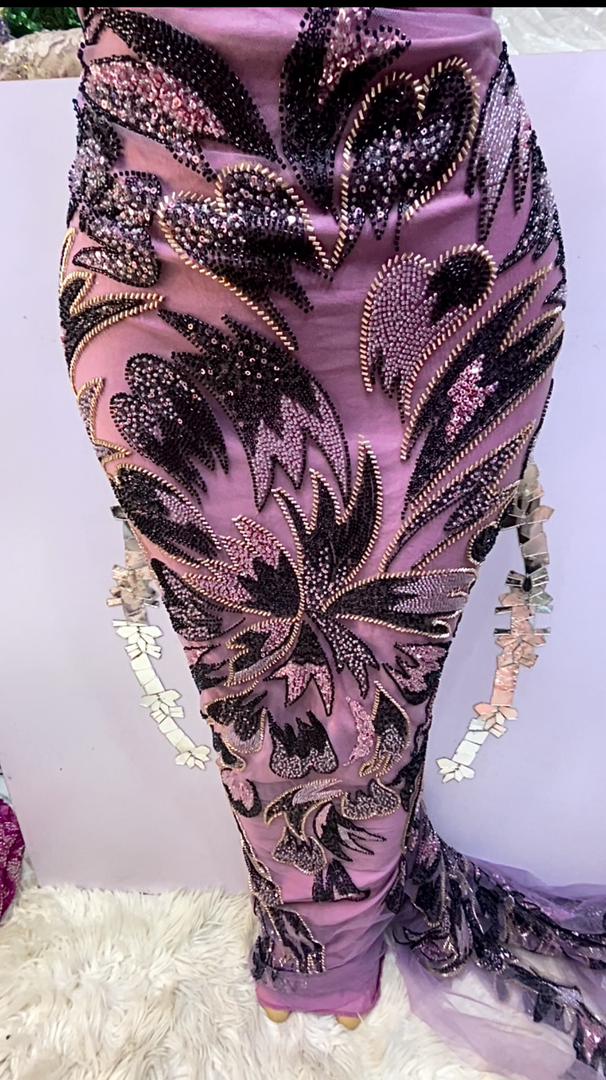 This fabric features luxurious beaded tulle lace delicately embellished with beads that shimmer with every movement, adding an elegant touch to any outfit. The intricate tulle design offers a soft, romantic aesthetic, while the rich color allows for versatility in styling. This lace is perfect for creating statement pieces for your aso ebi or special occasions.