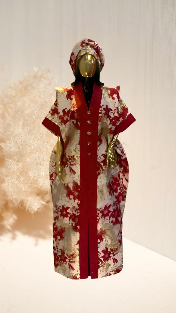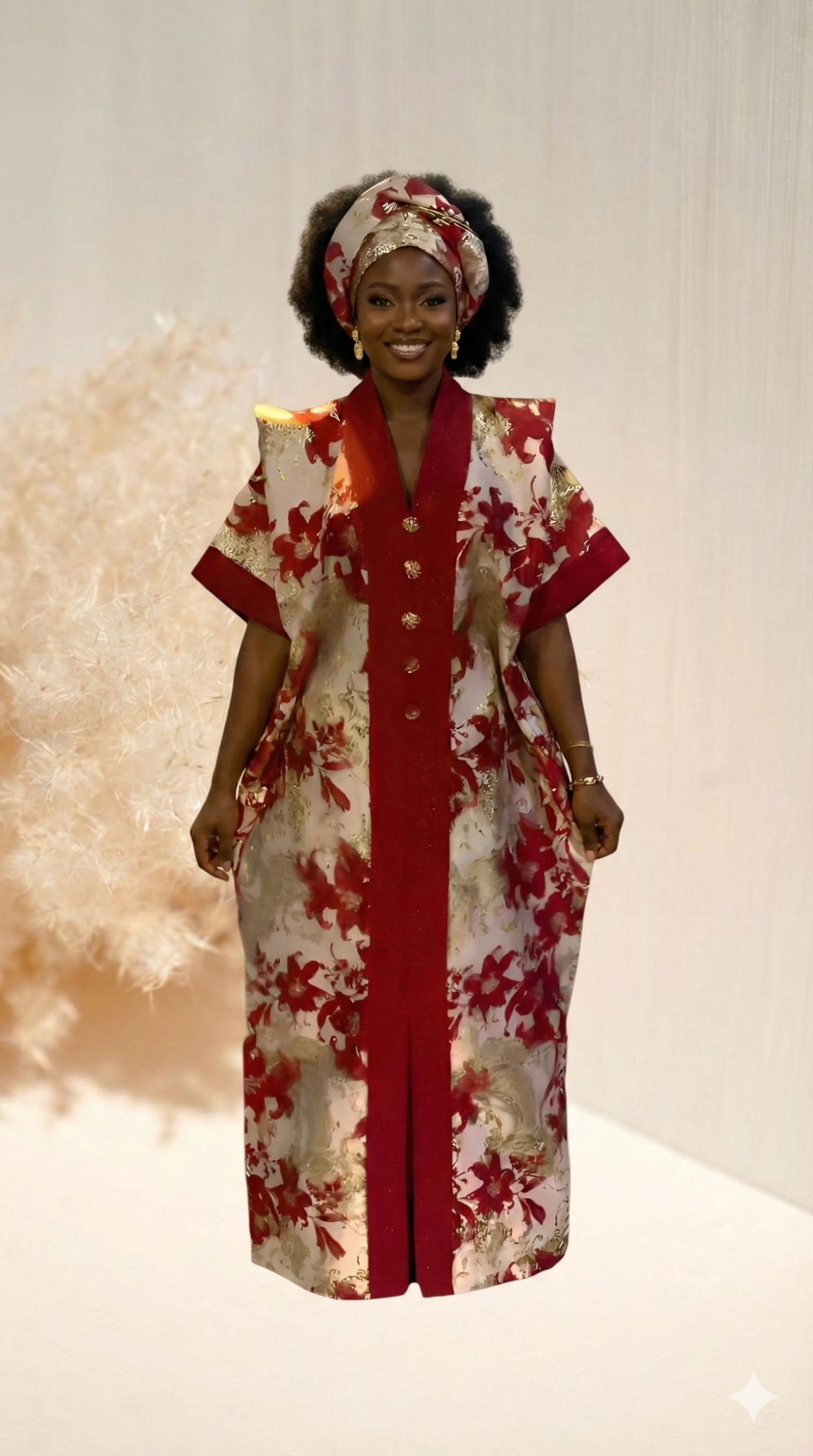 This boubou is a timeless blend of cultural elegance and modern sophistication. Typically crafted from high-quality fabric it showcases intricate patterns, bold colors, and metallic accents. Its flowing silhouette ensures both comfort and a regal appearance, perfect for formal events and celebrations.It comes paired with a matching headpiece to complete the look, making it a satement of heritage, grace, and luxury, designed to celebrate African fashion in all its splendor.